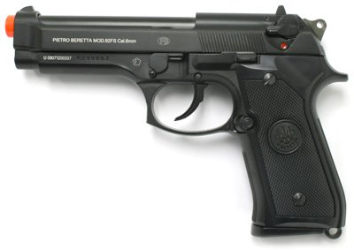 full metal gas blow back is also very powerful. The slide kicks back hard and small recoil could be felt upon firing. The high capacity magazine holds 25 rounds. Velocity: 390fps with 0.12g BBs, 330fps with 0.2g BBs 300fps with 0.25g BBs For the best accuracy with this gun, we recommend to use .20g BB and 0.25g BBs.... The KJW M9's full metal body and metal parts add to the realistic look and feel of this pistol. Metal parts include: slide, outer barrel, frame, safety, hammer, slide catch, disassembly lever, magazine, hop up chamber, front & rear sight. The price for this gun is just unbelievable considering the full metal construction and its performance. Single and double actionThe gun has the locking slide. (when out of ammo the slide will stay in back position).The gun has the decocker (resets the hammer to the forward position for safe carrying).Package includes: Beretta 92FS Full Metal Airsoft Pistol, 25 rounds Magazine, Speedloader, 100 Rds 0.20g BBs, Instruction Manual.... Official Licensed Product Distributed by: Cybergun Comes with orange tip to comply with federal law Specifications: Magazine Capacity - 25 Length - 8.5 in Weight - 1.95bs Adjustable Spin UP System Full Trademarks Made in Taiwan...